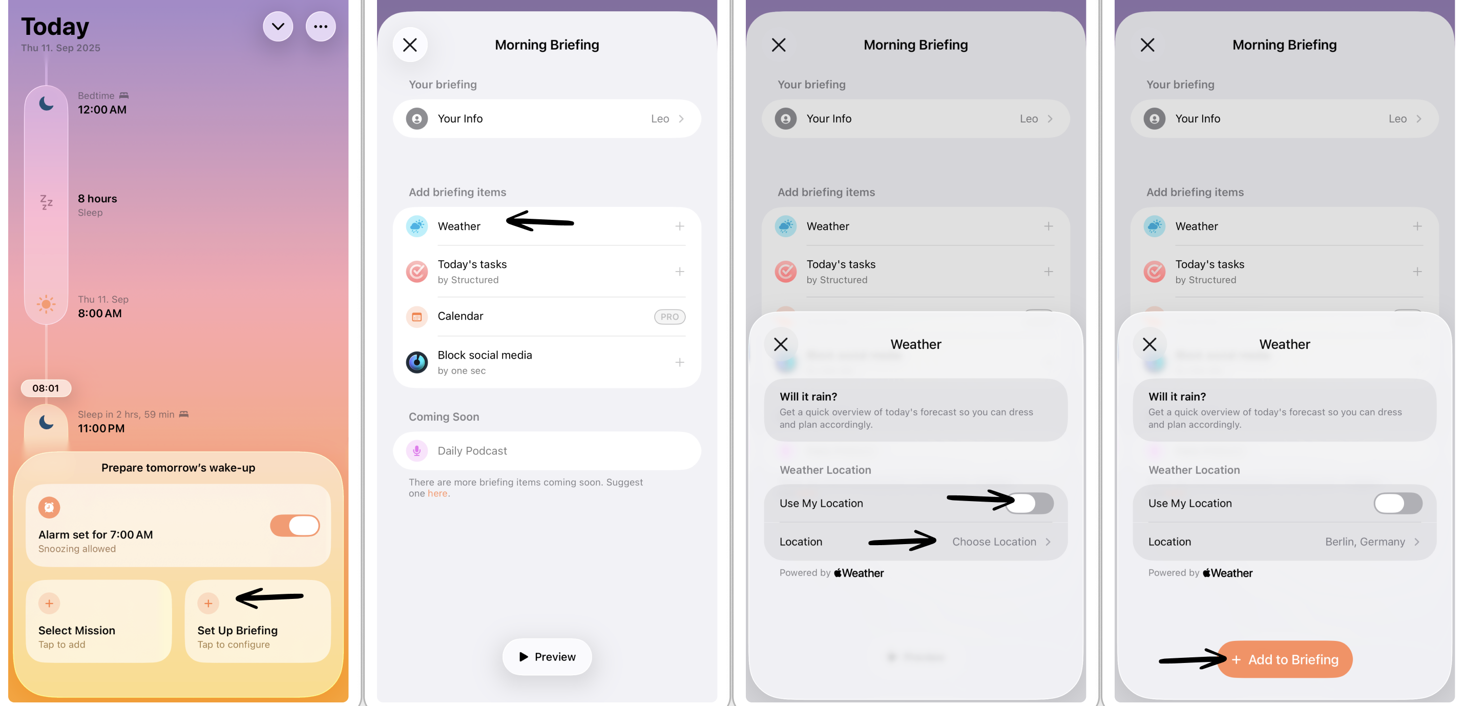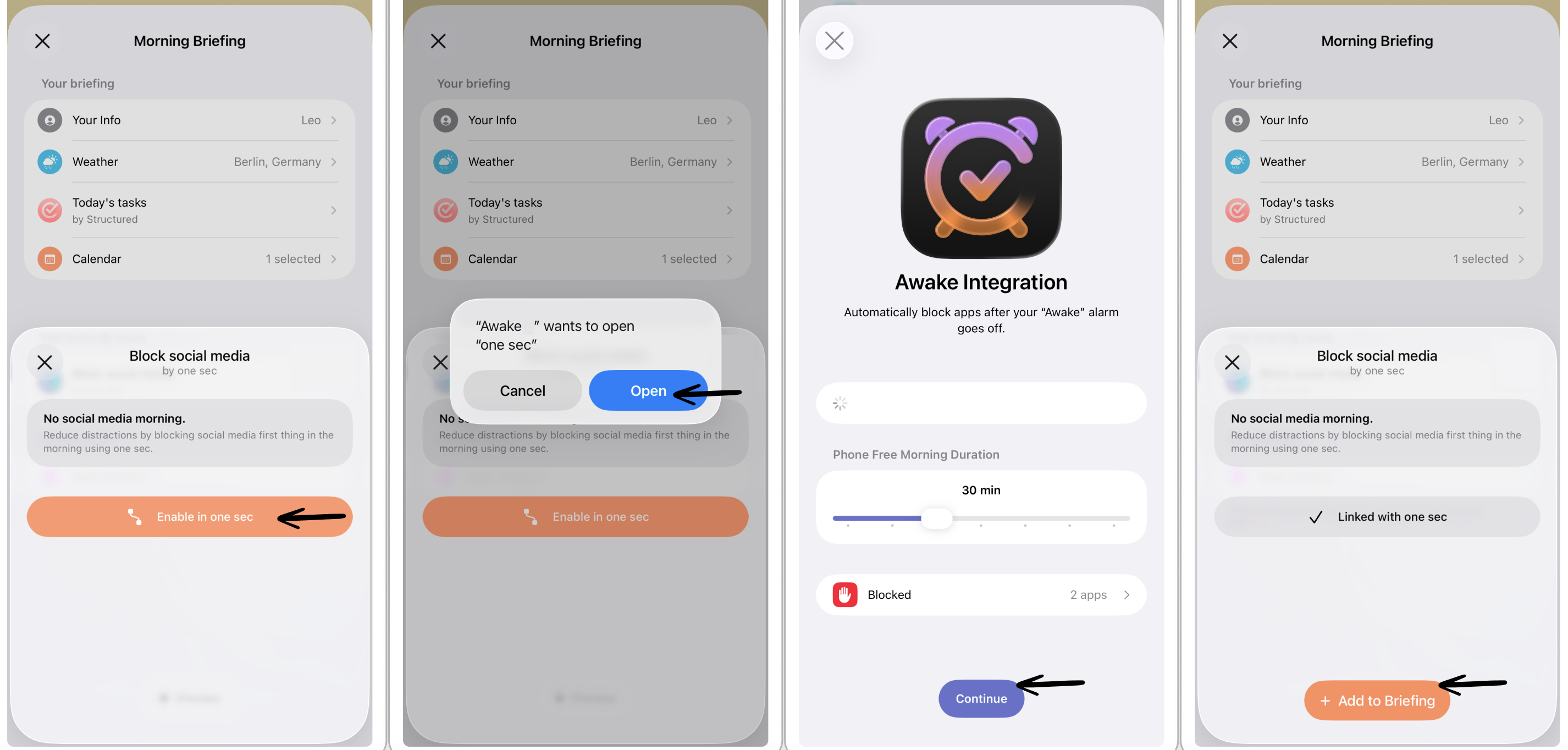 You decide what should be placed in your morning briefing. You can add the weather forecast, integrate Structured to get an overview of what's on your list today, or block your social media access in the morning with one sec.