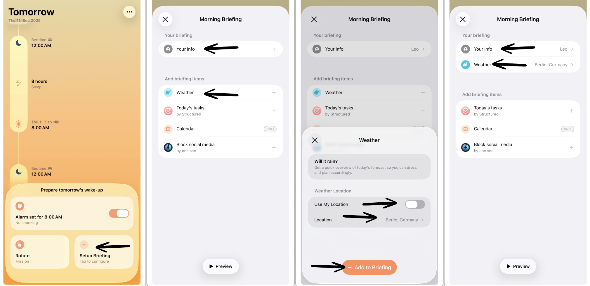 By tapping Add to Briefing, the respective feature will appear in your morning briefing. Tap Preview at the bottom of your screen to get a preview of your morning briefing.