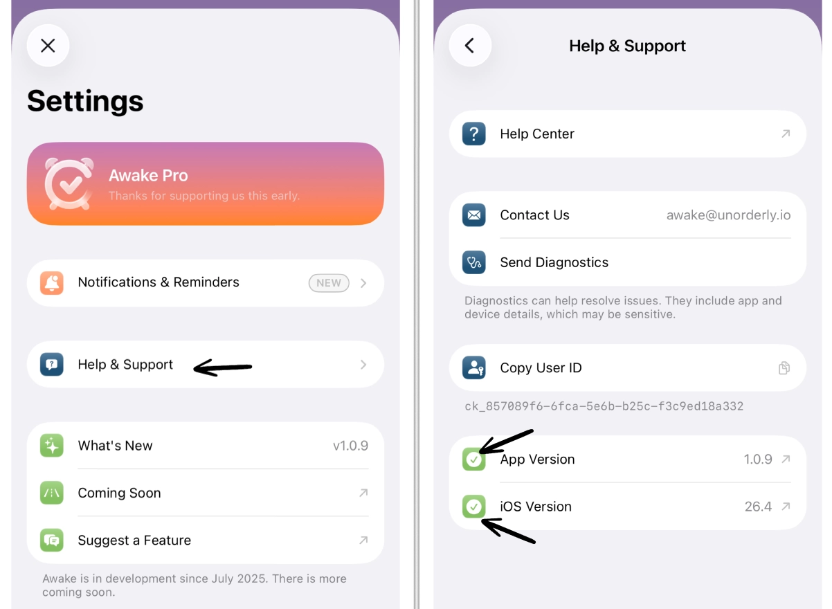 If you encounter an issue with Awake, it is often caused by an outdated app or iOS version. You can quickly check both directly in your Awake settings.