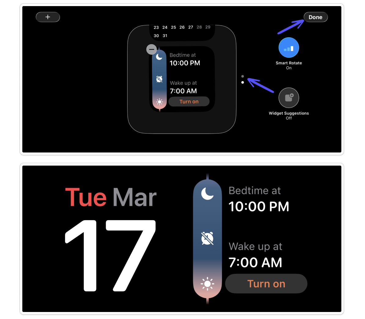 With iOS 17 or later, your iPhone will automatically enter StandBy mode when your iPhone is charging and in a horizontal position. Here, your phone can display the time, pictures, or widgets. The Awake widget allows you to quickly confirm your bedtime and alarm status.